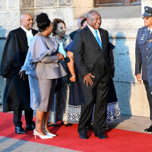 2月12日,在南非开普敦,南非总统拉马福萨(中)抵达开普敦市政厅。