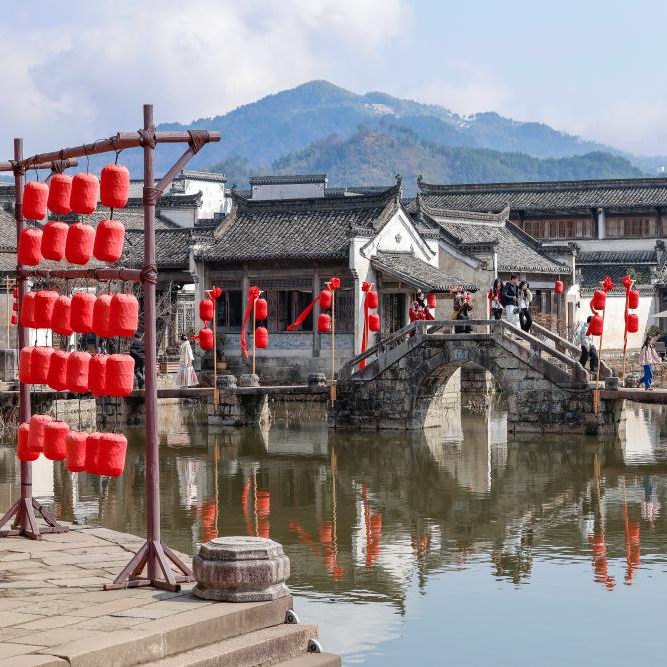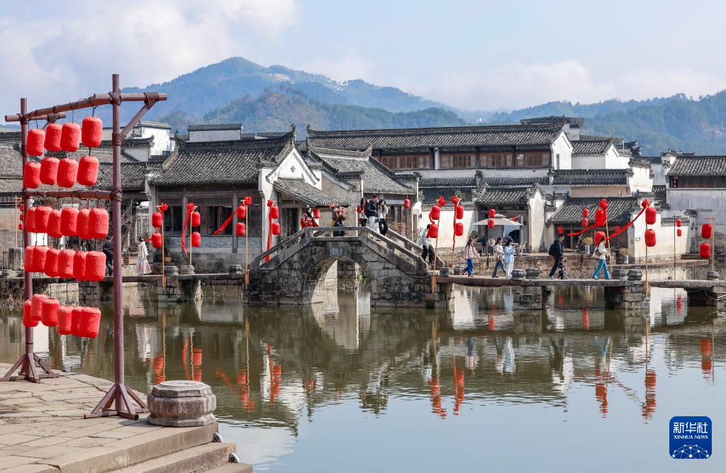 2月14日,游客在安徽省黄山市徽州区呈坎古村游玩。