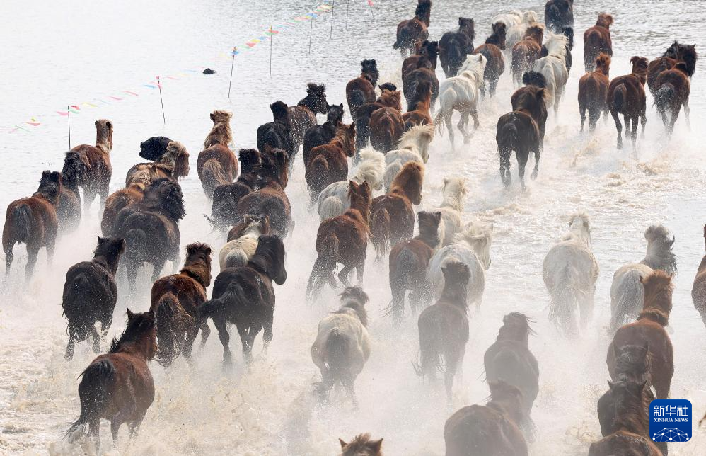 2月12日,骏马在南通森林野生动物园踏水驰骋。