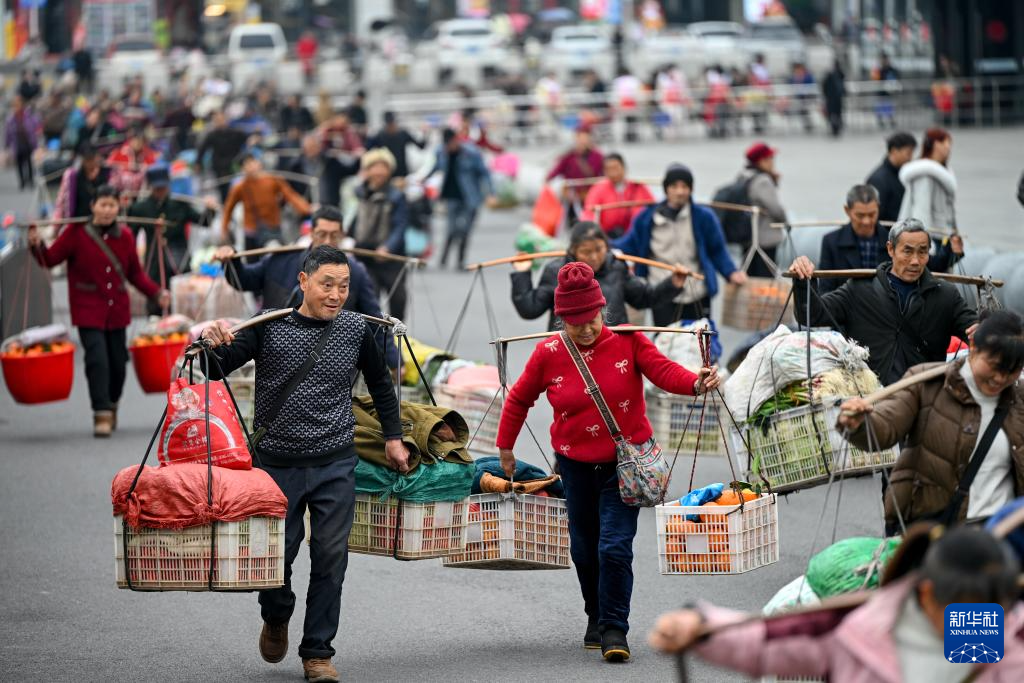 2月12日,在贵州省铜仁市铜仁站,来自湖南的菜农挑着果蔬出站,准备前往附近的农贸市场销售。