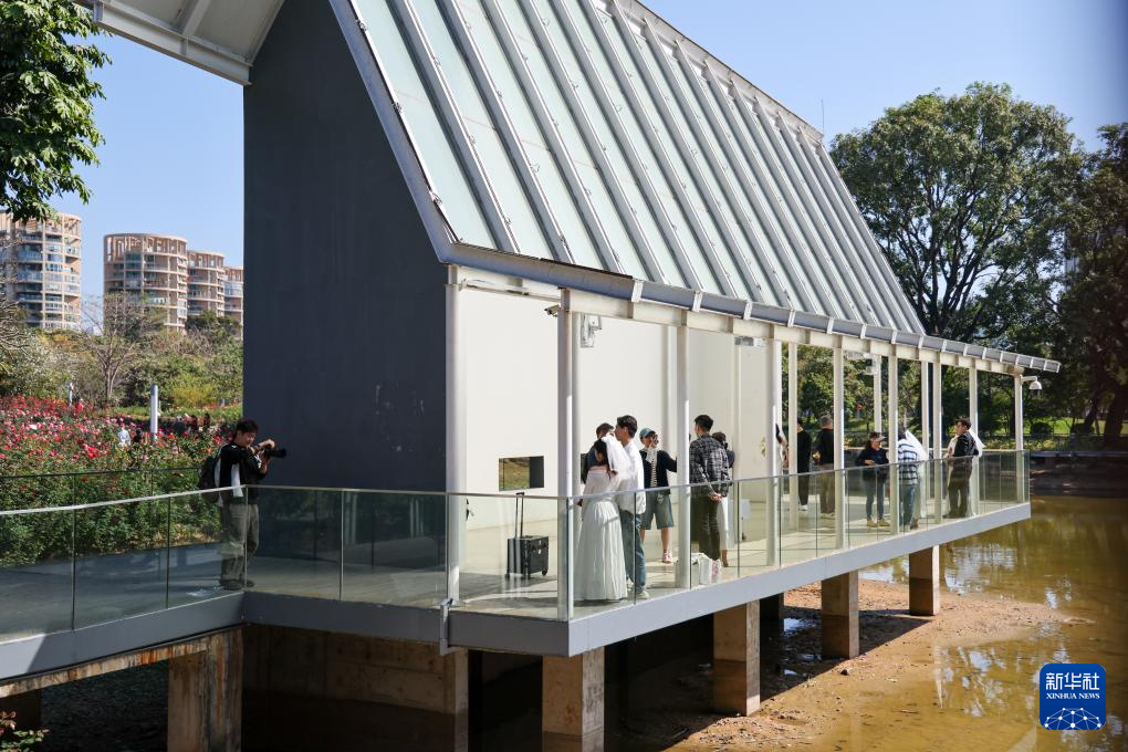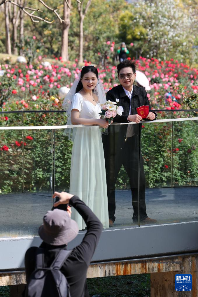 2月14日,在位于深圳市福田区香蜜公园内的婚姻登记处,新人在花园里拍照留念。