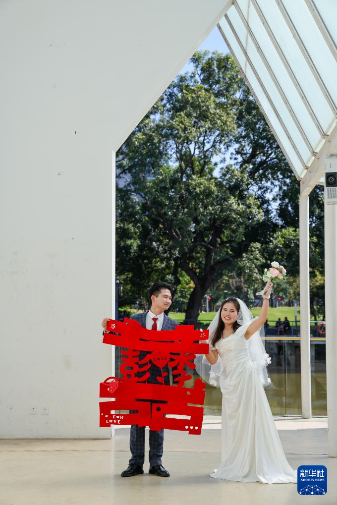 2月14日,在位于深圳市福田区香蜜公园内的婚姻登记处,新人在中式颁证厅拍照留念。