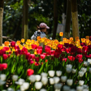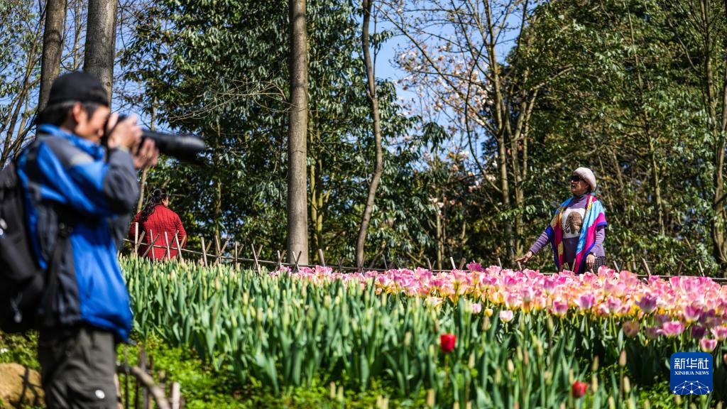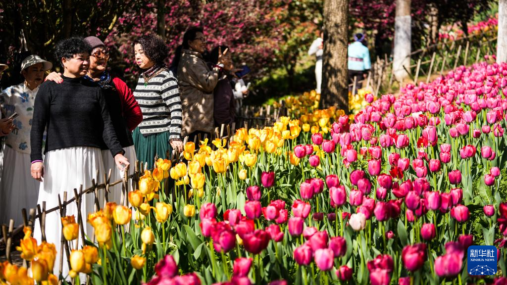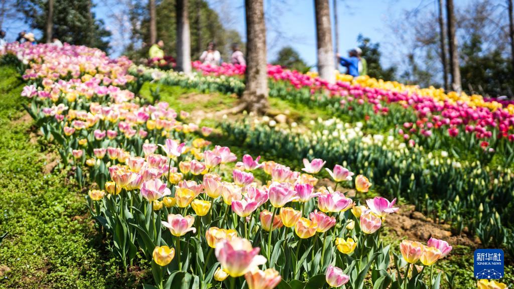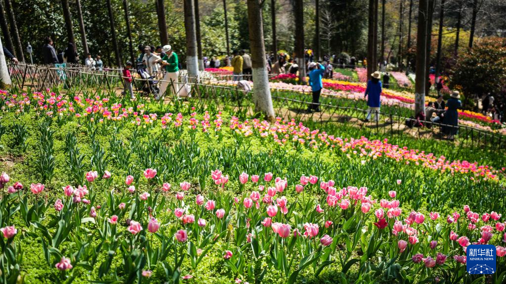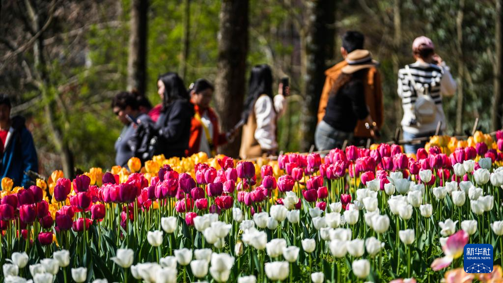 近日,贵州省黔南布依族苗族自治州龙里县龙架山国家森林公园内的数万株郁金香竞相绽放,吸引各地游客前来游玩赏景。