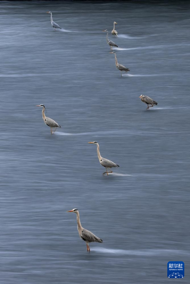 3月17日,一群鹭鸟在锦江河道中迎着逆流“站桩”觅食。