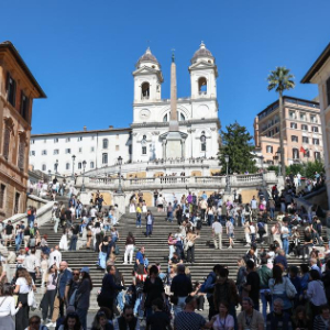 4月4日,游客在意大利首都罗马的西班牙广场参观游览。