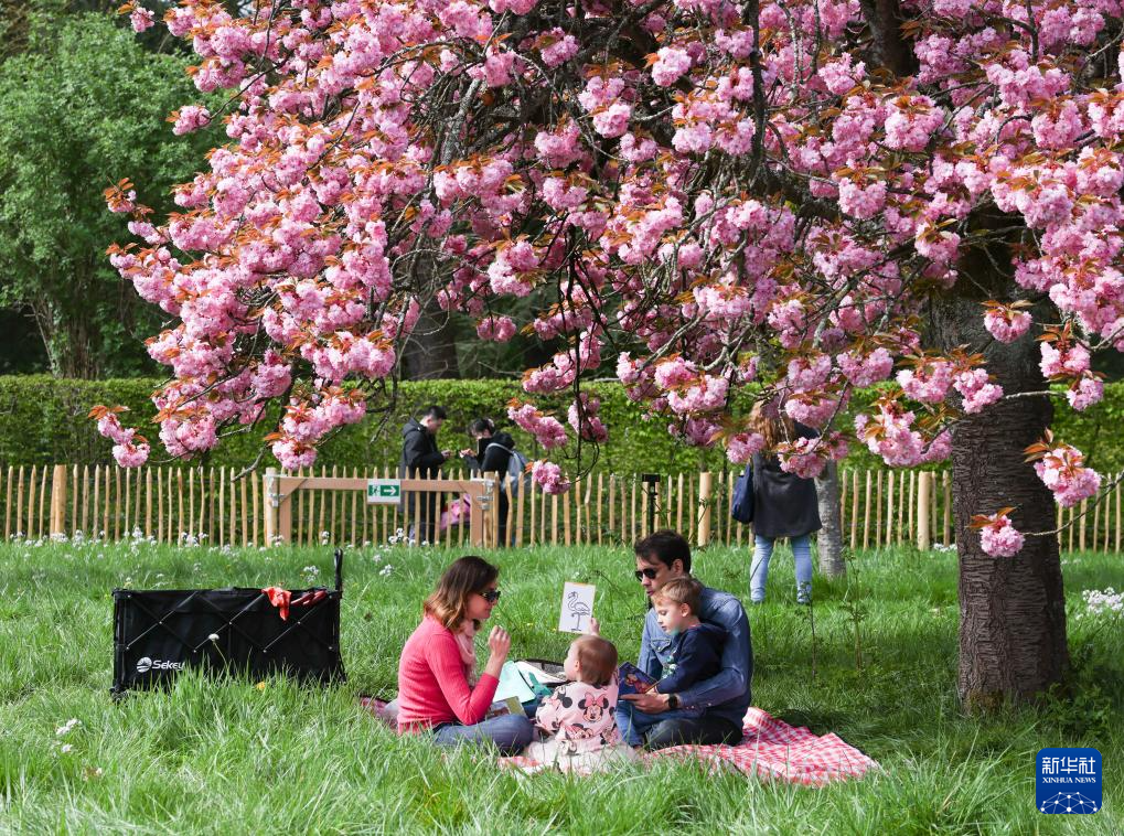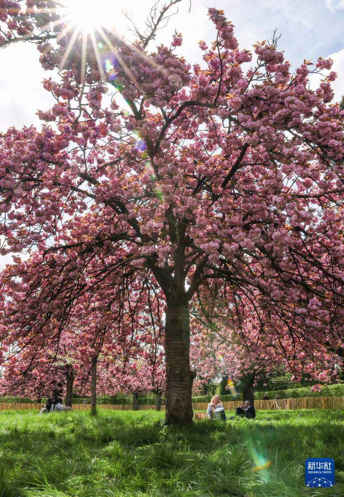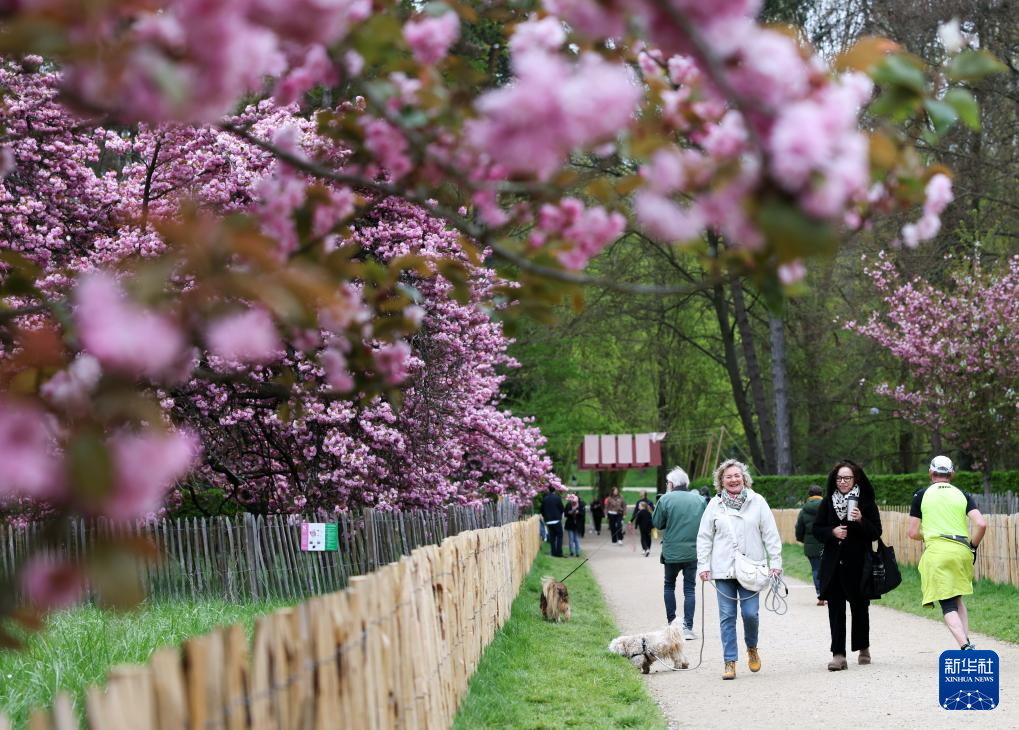4月5日,人们在法国巴黎近郊索镇的国玺公园赏花拍照。
