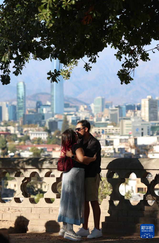4月5日,一对情侣在智利圣地亚哥的圣卢西亚山公园拥抱。