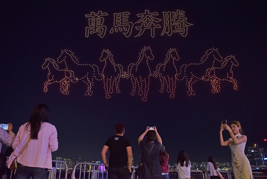 2月14日,由2026架无人机呈现的大型无人机表演在香港湾仔海滨闪亮登场,为即将到来的马年新春增添喜庆祥和的节日气氛。