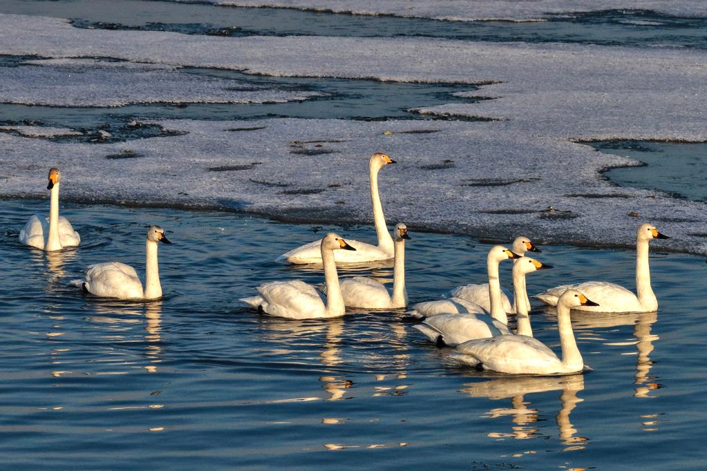 近日,随着气温回升,黑龙江省佳木斯市境内的松花江富锦段冰融水暖,迎来大批北归天鹅。