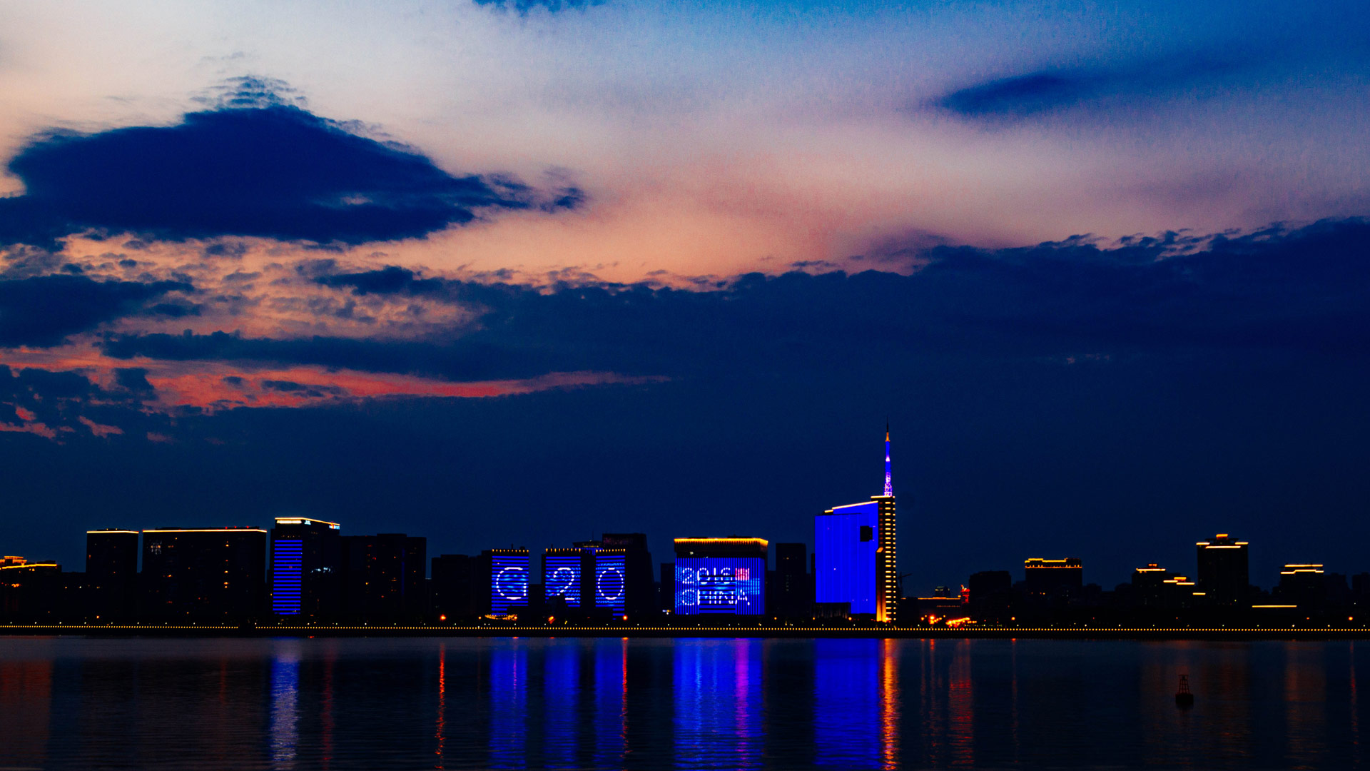 杭州錢塘江岸邊建筑的主題燈光秀(8月31日攝)。新華社記者劉金海攝