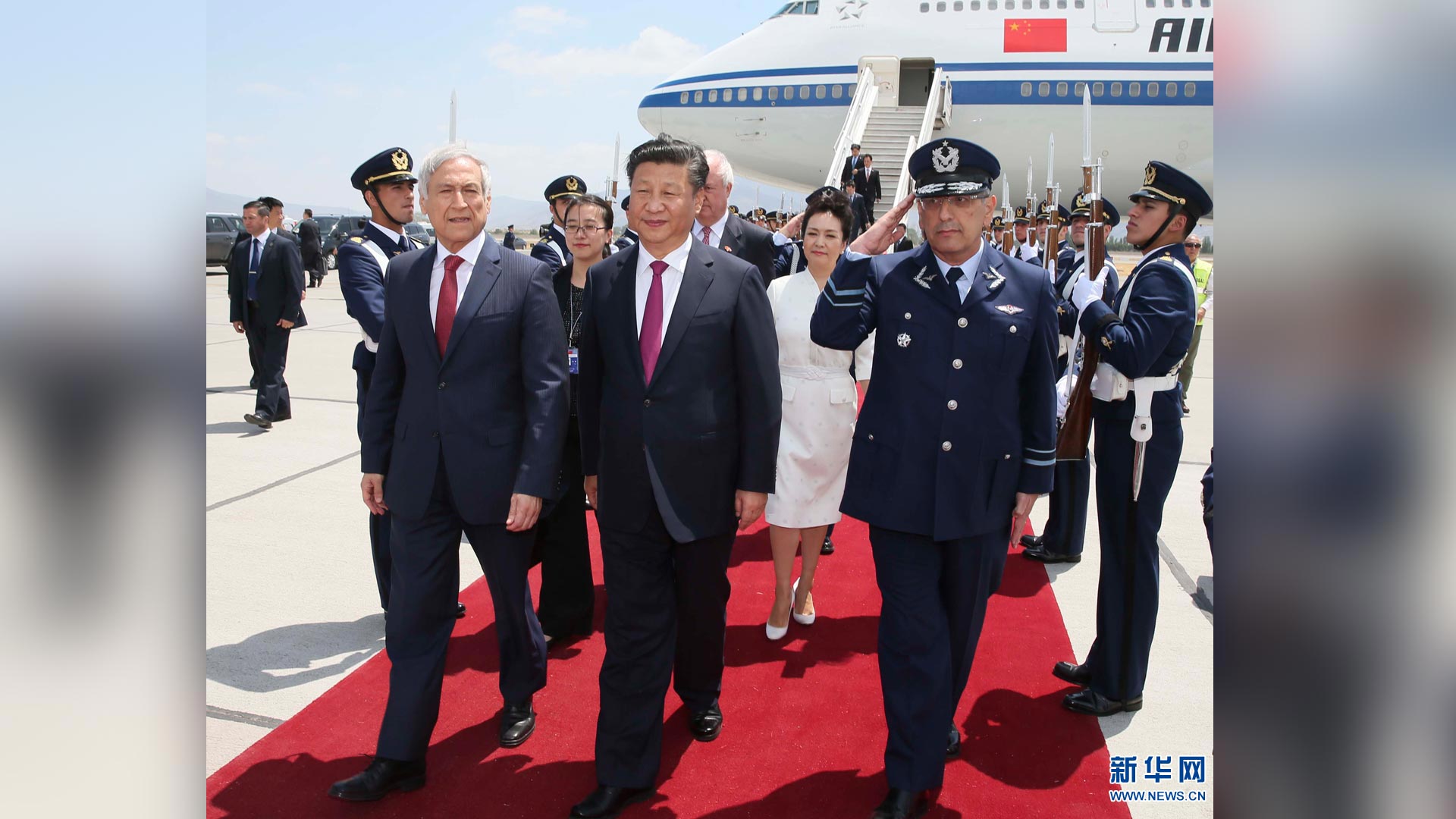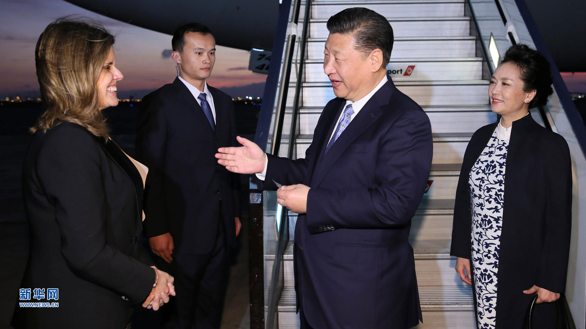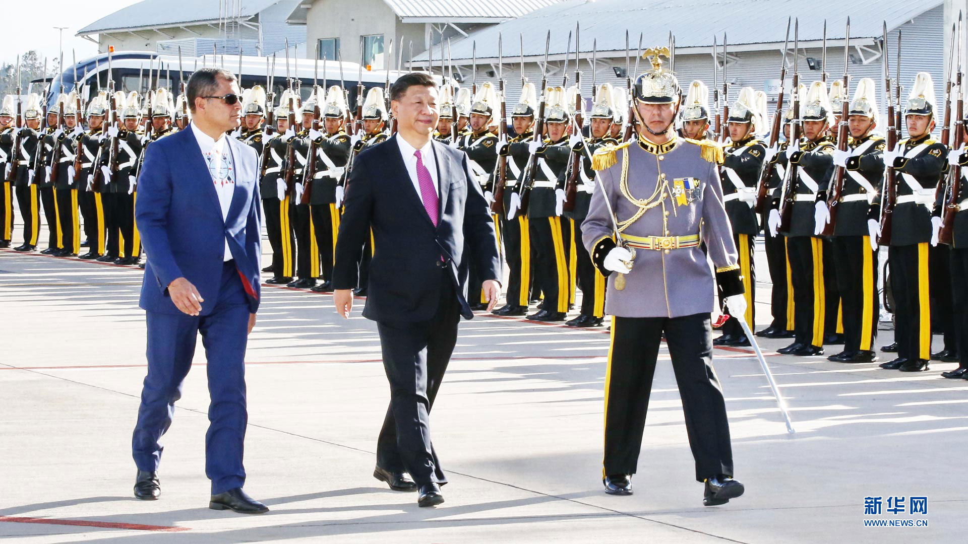 11月22日,國(guó)家主席習(xí)近平抵達(dá)圣地亞哥,對(duì)智利共和國(guó)進(jìn)行國(guó)事訪問(wèn)。智利外長(zhǎng)穆尼奧斯等在機(jī)場(chǎng)迎接習(xí)近平和夫人彭麗媛。 新華社記者蘭紅光 攝2016-11-23