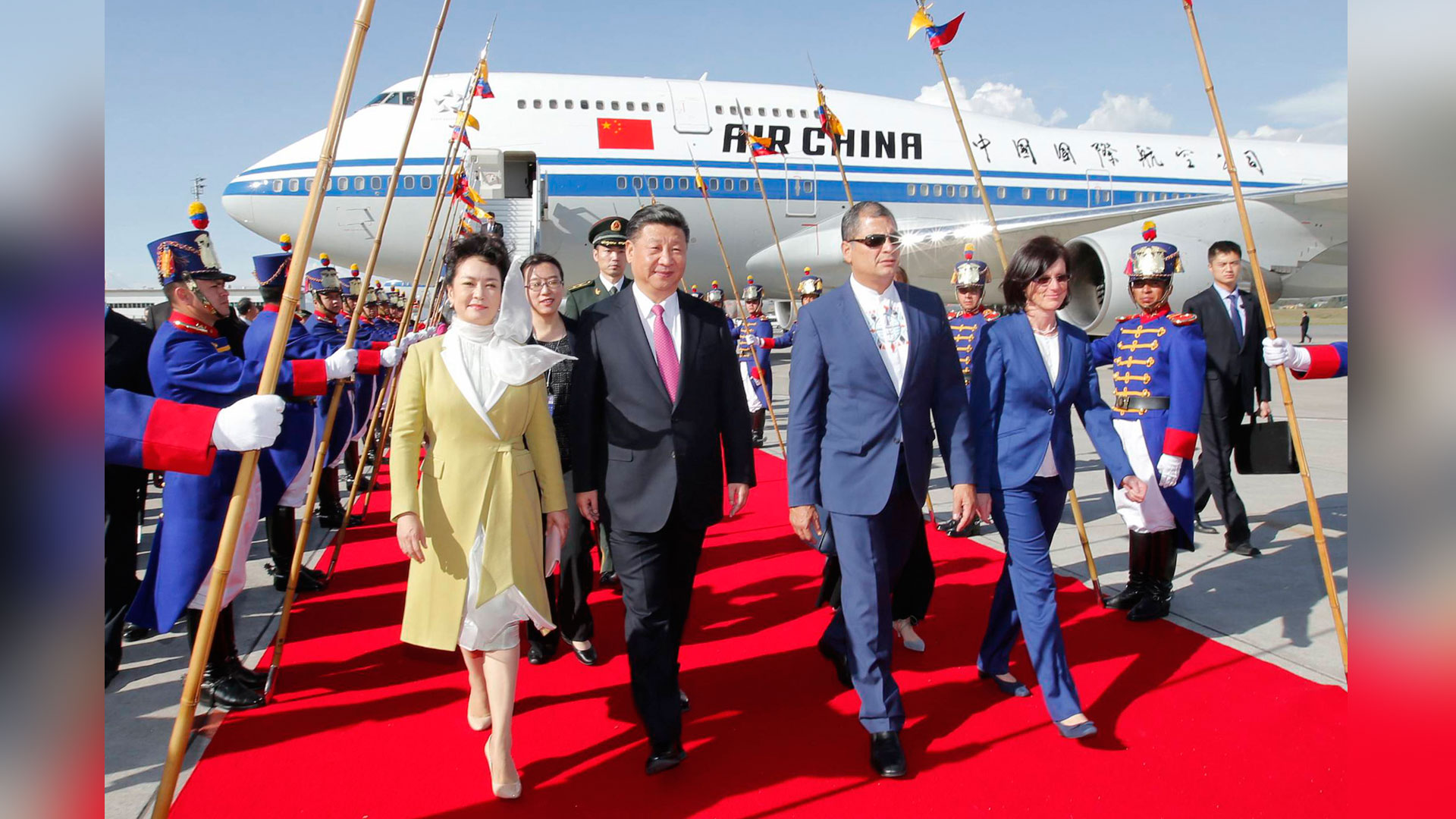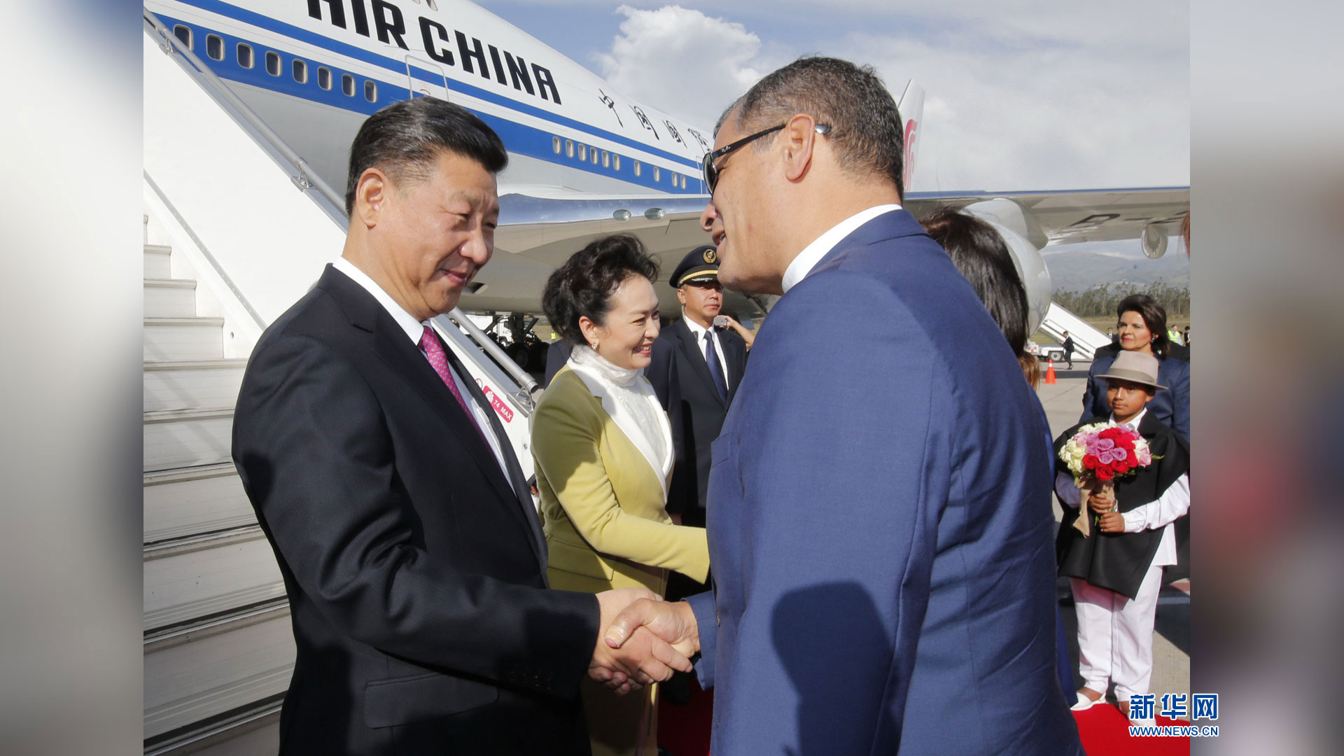 當(dāng)?shù)貢r(shí)間11月17日,國(guó)家主席習(xí)近平乘專機(jī)抵達(dá)基多,開始對(duì)厄瓜多爾共和國(guó)進(jìn)行國(guó)事訪問(wèn)。厄瓜多爾總統(tǒng)科雷亞和夫人馬勒布等在機(jī)場(chǎng)熱情迎接習(xí)近平和夫人彭麗媛。新華社記者 鞠鵬 攝2016-11-18