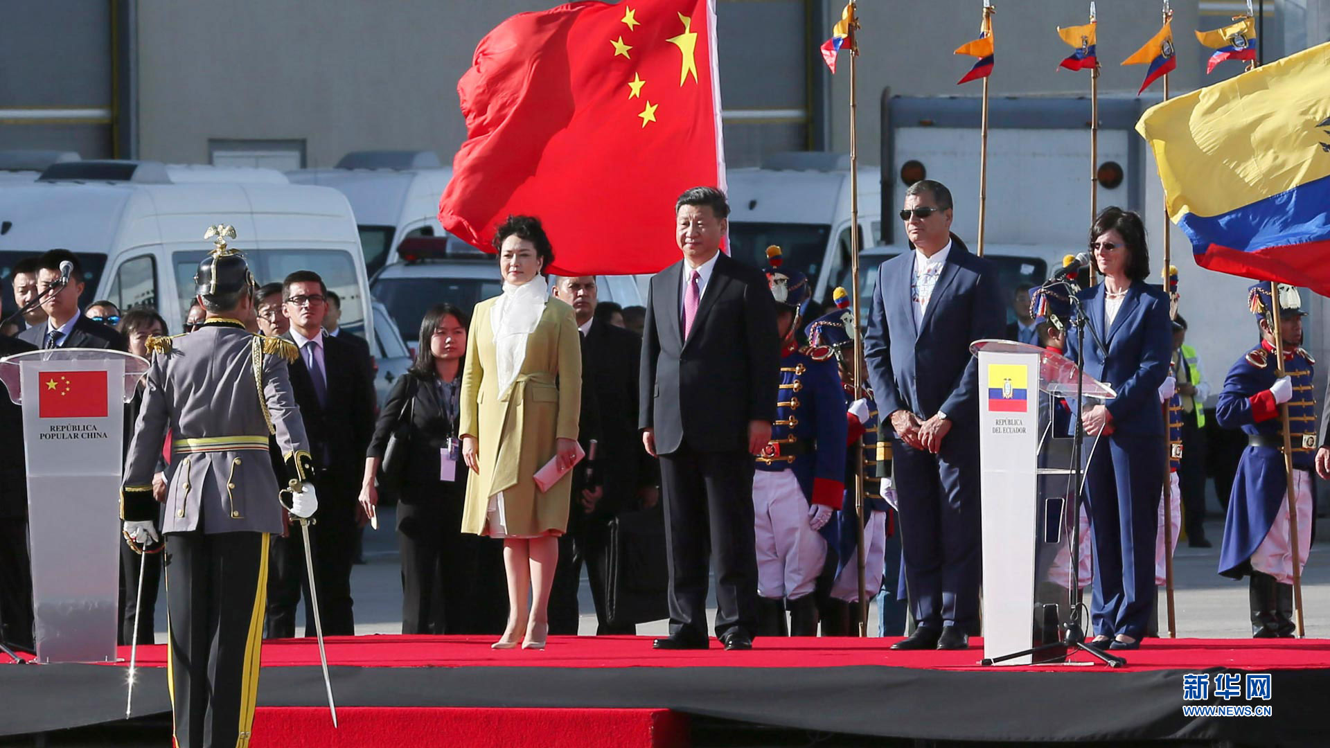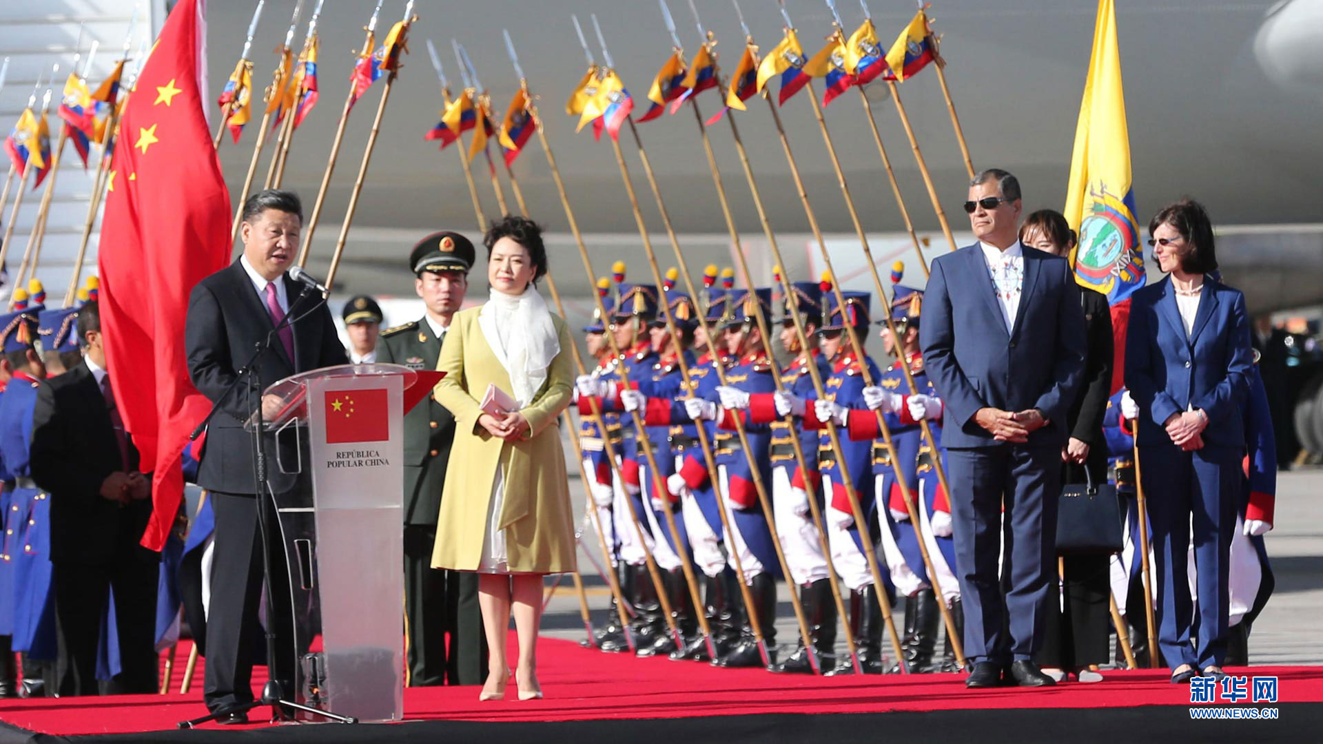 當(dāng)?shù)貢r(shí)間11月17日,國(guó)家主席習(xí)近平乘專機(jī)抵達(dá)基多,開始對(duì)厄瓜多爾共和國(guó)進(jìn)行國(guó)事訪問(wèn)。這是厄瓜多爾總統(tǒng)科雷亞在機(jī)場(chǎng)為習(xí)近平舉行隆重歡迎儀式。新華社記者 鞠鵬 攝2016-11-18