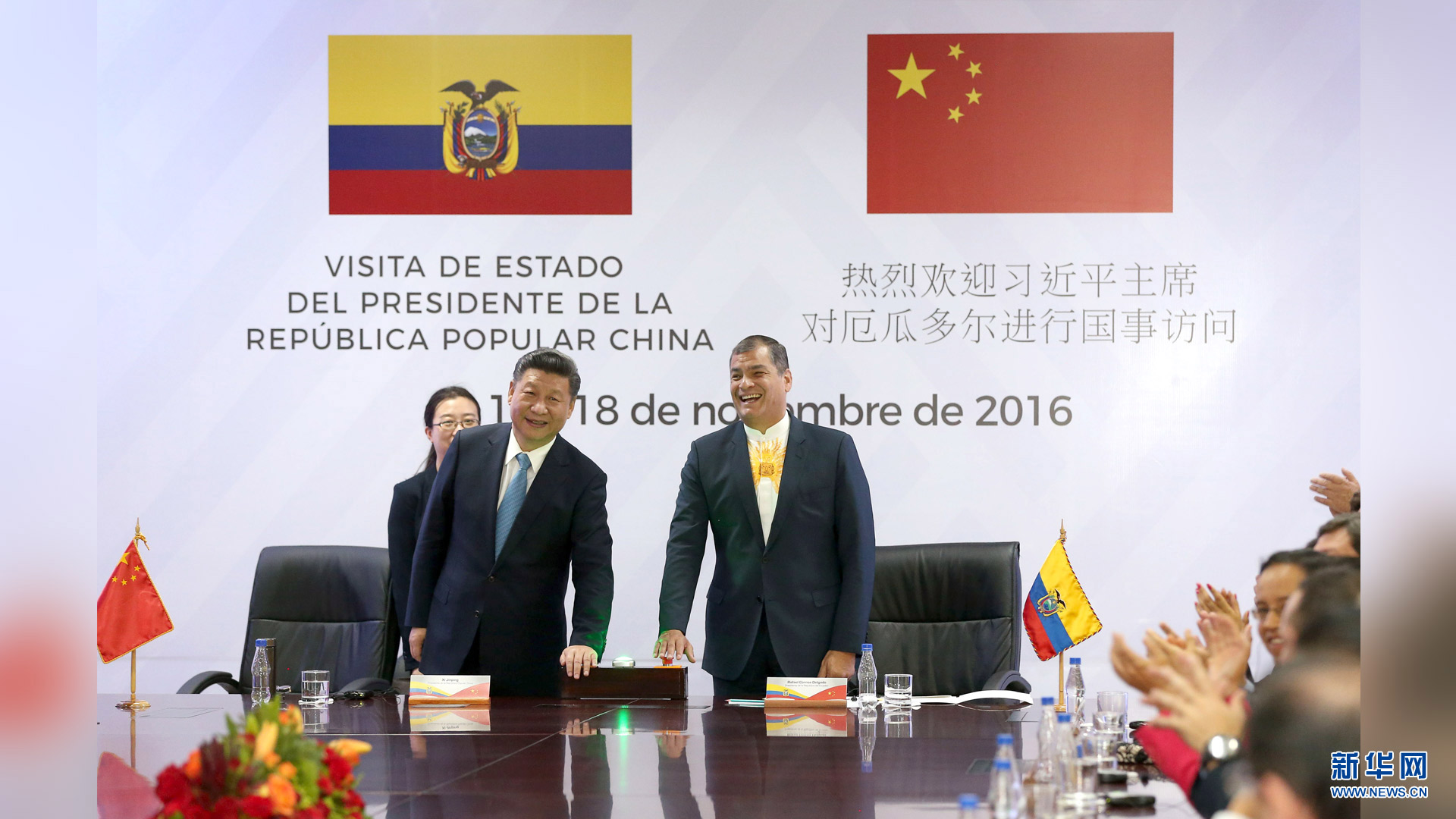 當(dāng)?shù)貢r(shí)間11月17日,國(guó)家主席習(xí)近平在基多同厄瓜多爾總統(tǒng)科雷亞舉行會(huì)談。這是會(huì)談后,兩國(guó)元首見(jiàn)證雙邊合作文件的簽署。 新華社記者 鞠鵬攝2016-11-18