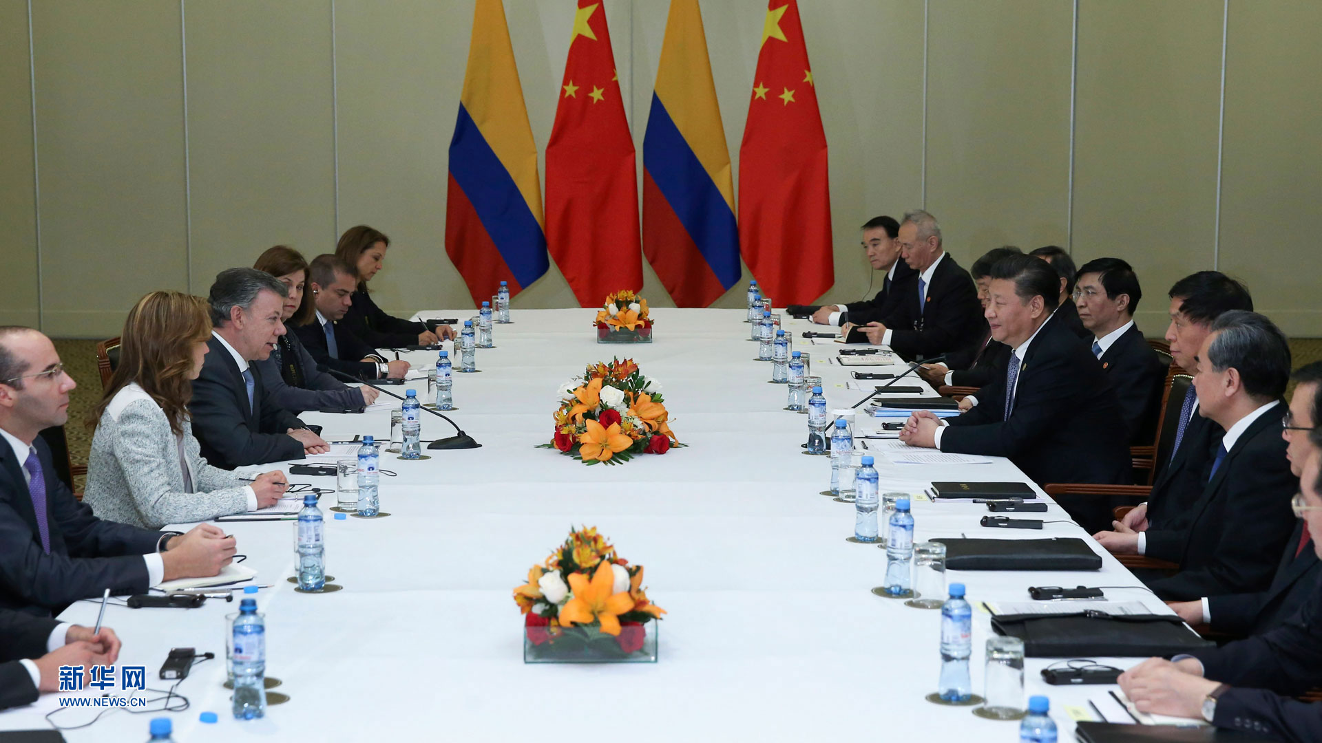 11月19日,國(guó)家主席習(xí)近平在利馬會(huì)見(jiàn)哥倫比亞總統(tǒng)桑托斯。新華社記者 李濤 攝2016-11-20