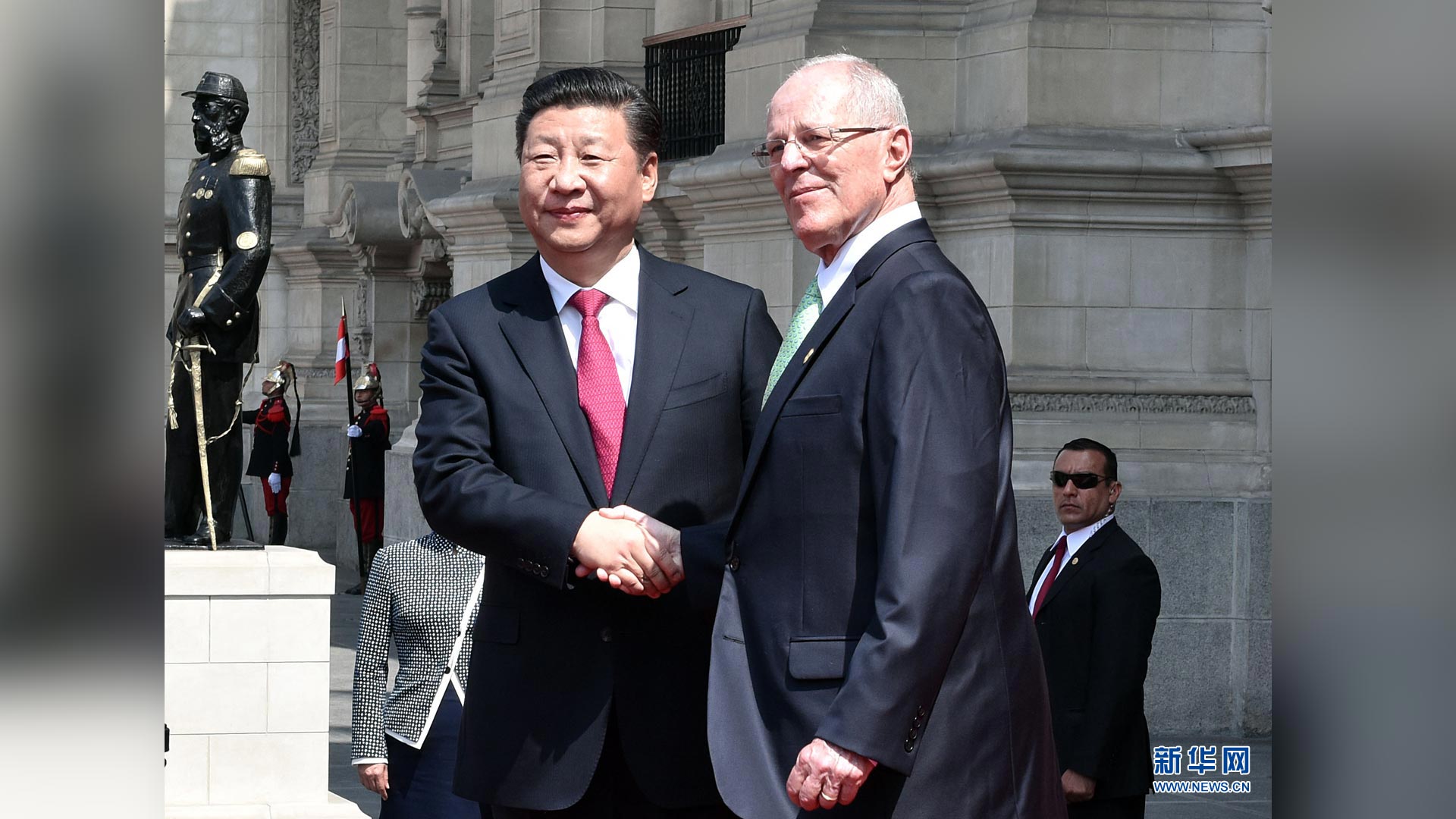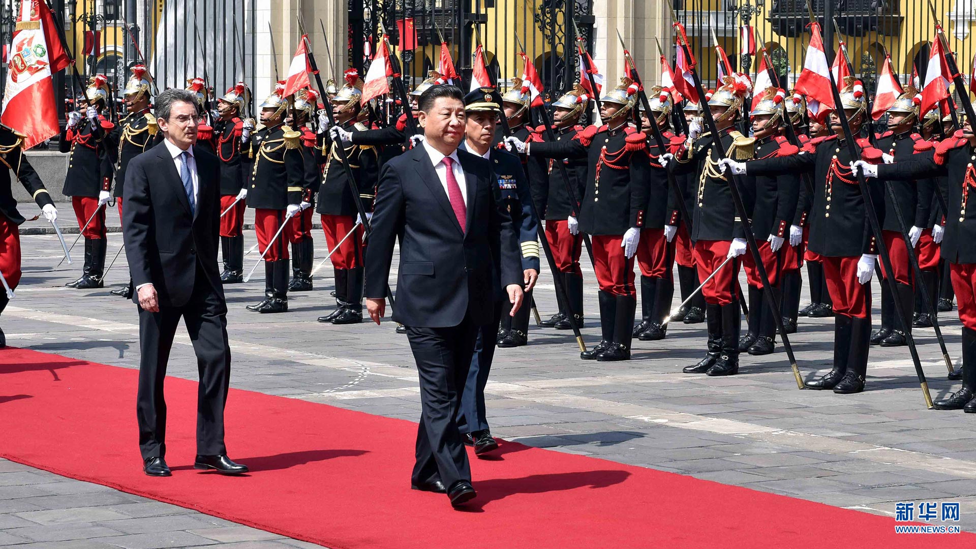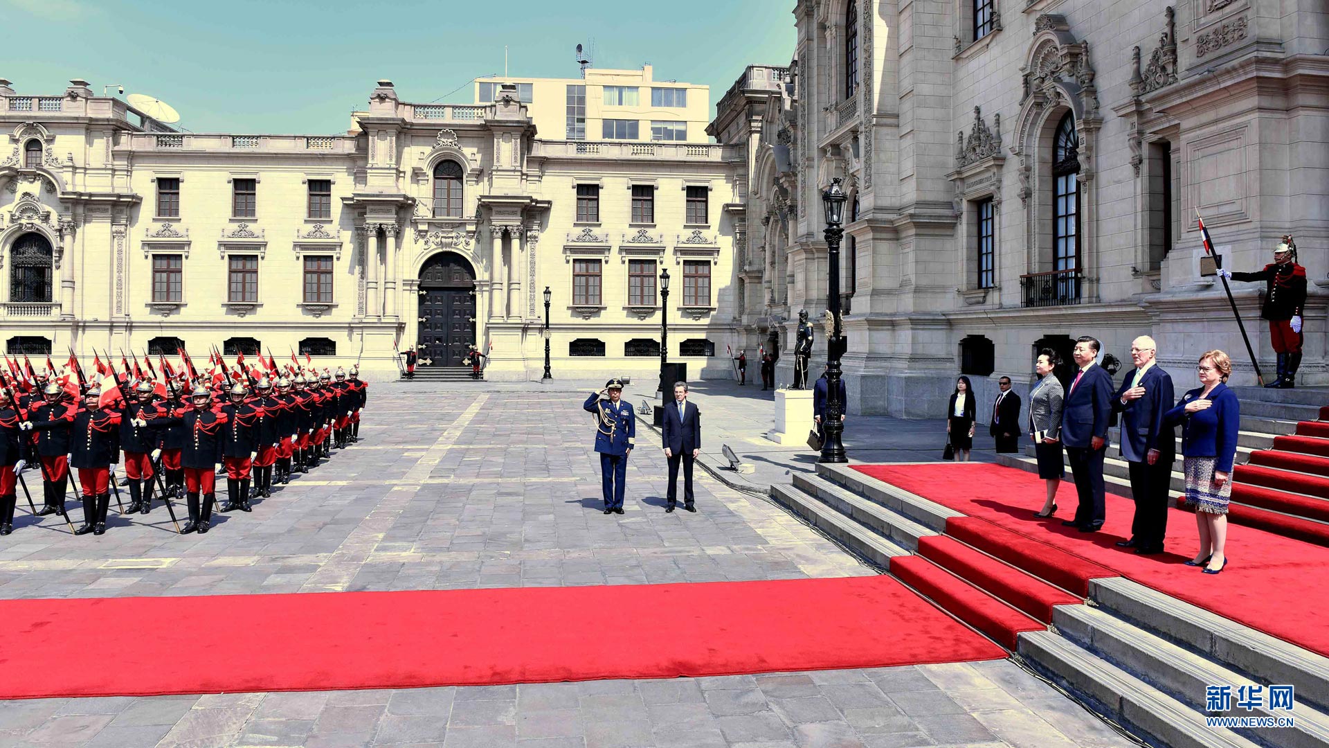 11月21日,國(guó)家主席習(xí)近平在利馬同秘魯總統(tǒng)庫(kù)琴斯基舉行會(huì)談。會(huì)談前,習(xí)近平出席庫(kù)琴斯基在總統(tǒng)府前廣場(chǎng)舉行的歡迎儀式。 新華社記者李濤 攝2016-11-23