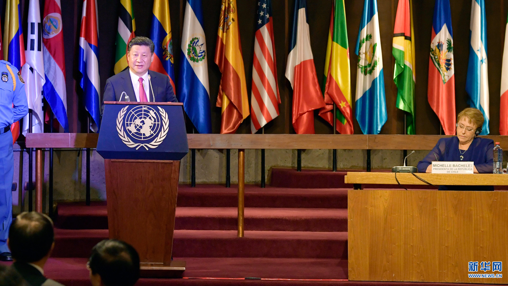 11月22日,國(guó)家主席習(xí)近平在圣地亞哥聯(lián)合國(guó)拉丁美洲和加勒比經(jīng)濟(jì)委員會(huì)總部出席中拉媒體領(lǐng)袖峰會(huì)開幕式。智利總統(tǒng)巴切萊特陪同出席。在熱烈的掌聲中,習(xí)近平發(fā)表題為《開創(chuàng)中拉媒體合作新局面》的致辭。新華社記者 鞠鵬 攝2016-11-23
