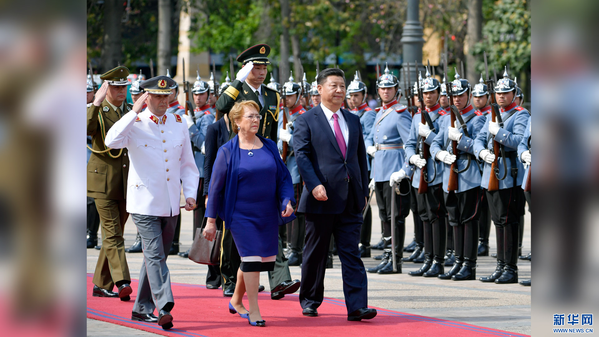 11月22日,國(guó)家主席習(xí)近平在圣地亞哥同智利總統(tǒng)巴切萊特舉行會(huì)談。這是會(huì)談前,習(xí)近平出席巴切萊特在憲法廣場(chǎng)舉行的隆重歡迎儀式。新華社記者 王曄 攝2016-11-23