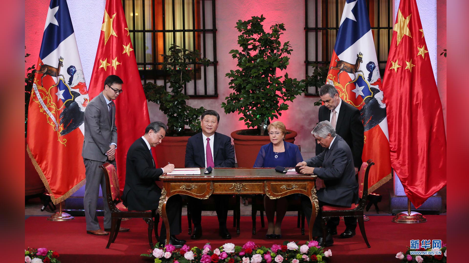 11月22日,國(guó)家主席習(xí)近平在圣地亞哥同智利總統(tǒng)巴切萊特舉行會(huì)談。這是會(huì)談后,兩國(guó)元首見(jiàn)證經(jīng)貿(mào)、農(nóng)業(yè)、質(zhì)檢、文化、教育、電子商務(wù)、信息通信、金融等領(lǐng)域多項(xiàng)雙邊合作文件的簽署。新華社記者 蘭紅光 攝2016-11-23