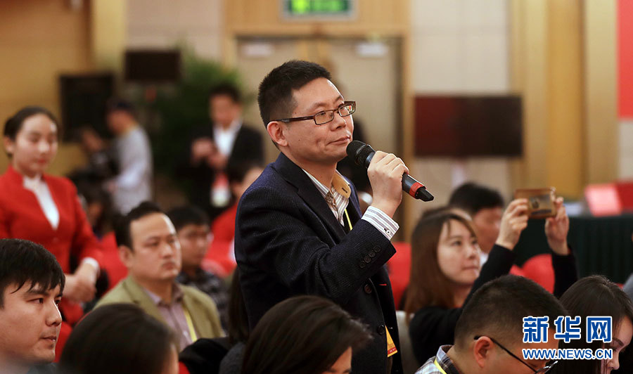 ??? 10月19日,十九大新聞中心舉辦集體采訪,邀請(qǐng)政法戰(zhàn)線代表談全面推進(jìn)依法治國。圖為黨建雜志、黨建網(wǎng)記者提問。新華網(wǎng) 郝廣鵬攝