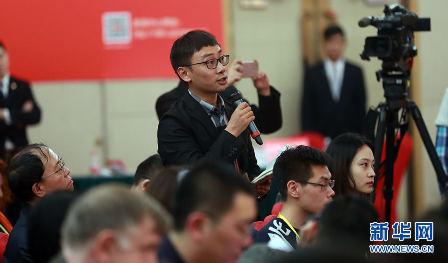 ??? 10月20日,十九大新聞中心舉辦集體采訪活動,主題為“文化發(fā)展開創(chuàng)新局面”。圖為光明日報(bào)融媒體記者提問。新華網(wǎng) 翟子赫攝