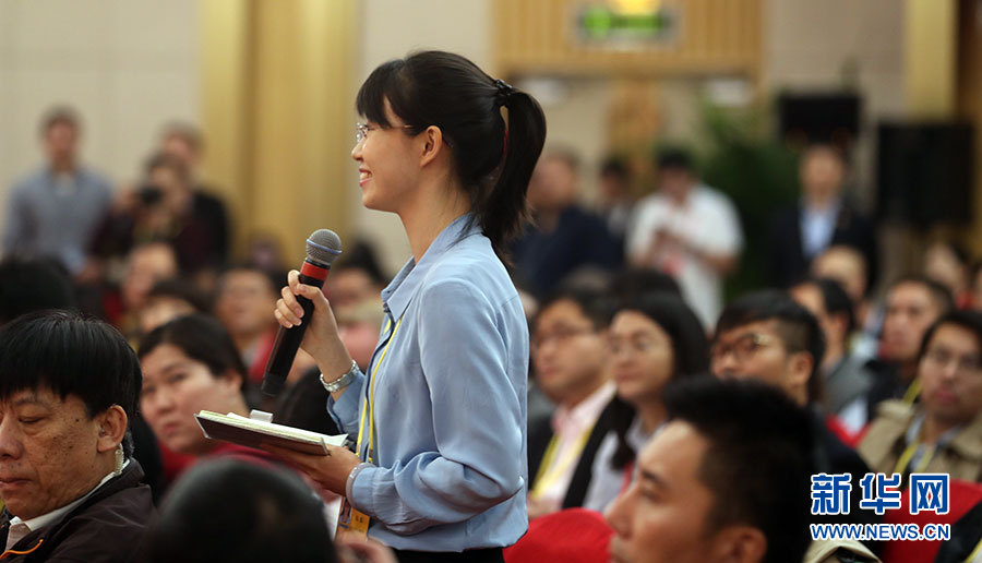 ???? 10月21日,十九大新聞中心舉辦記者招待會(huì),邀請(qǐng)中共中央統(tǒng)戰(zhàn)部常務(wù)副部長(zhǎng)張裔炯、副部長(zhǎng)冉萬祥,中共中央對(duì)外聯(lián)絡(luò)部副部長(zhǎng)郭業(yè)洲介紹黨的統(tǒng)一戰(zhàn)線工作和黨的對(duì)外交往情況,并回答記者提問。圖為中央人民廣播電臺(tái)記者提問。新華網(wǎng) 郝廣鵬攝