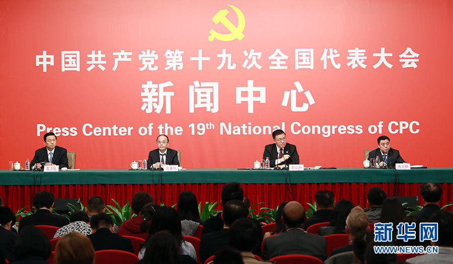 10月21日,十九大新聞中心舉辦記者招待會(huì),邀請(qǐng)中共中央統(tǒng)戰(zhàn)部常務(wù)副部長(zhǎng)張裔炯、副部長(zhǎng)冉萬(wàn)祥,中共中央對(duì)外聯(lián)絡(luò)部副部長(zhǎng)郭業(yè)洲介紹黨的統(tǒng)一戰(zhàn)線(xiàn)工作和黨的對(duì)外交往情況,并回答記者提問(wèn)。圖為記者招待會(huì)現(xiàn)場(chǎng)。新華網(wǎng) 郝廣鵬攝