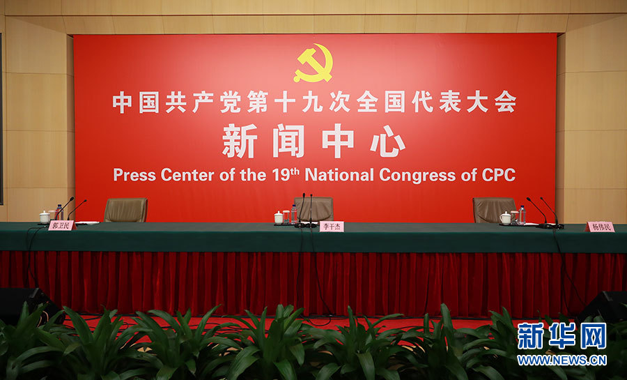 10月23日,十九大新聞中心舉辦記者招待會,邀請中央財經領導小組辦公室副主任楊偉民,環(huán)境保護部黨組書記、部長李干杰介紹踐行綠色發(fā)展理念,建設美麗中國有關情況,并回答記者提問。圖為記者招待會現(xiàn)場。新華網 郝廣鵬攝