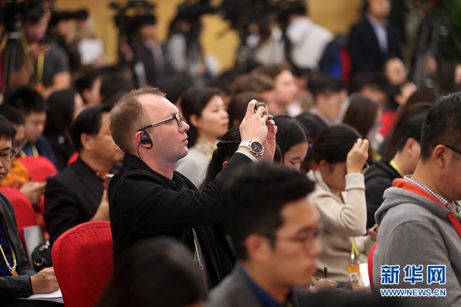 10月23日,十九大新聞中心舉辦記者招待會,邀請中央財經(jīng)領(lǐng)導小組辦公室副主任楊偉民,環(huán)境保護部黨組書記、部長李干杰介紹踐行綠色發(fā)展理念,建設(shè)美麗中國有關(guān)情況,并回答記者提問。圖為現(xiàn)場記者。新華網(wǎng) 郝廣鵬攝