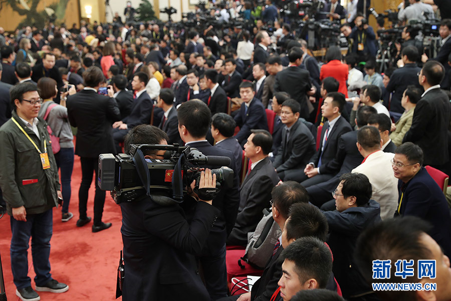 中外記者在見面會(huì)現(xiàn)場(chǎng)進(jìn)行準(zhǔn)備工作