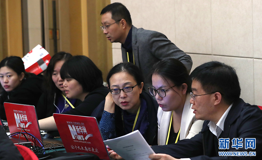 10月26日上午10:00,中國(guó)共產(chǎn)黨第十九次全國(guó)代表大會(huì)新聞發(fā)言人在梅地亞賓館二層新聞發(fā)布廳召開(kāi)專題新聞發(fā)布會(huì),請(qǐng)有關(guān)方面負(fù)責(zé)人解讀十九大報(bào)告,并回答記者關(guān)心的問(wèn)題。圖為新華網(wǎng)在現(xiàn)場(chǎng)直播。新華網(wǎng)?翟子赫 攝