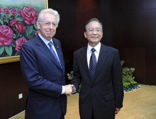 ??? 11月5日,國(guó)務(wù)院總理溫家寶在老撾首都萬(wàn)象會(huì)見(jiàn)出席第九屆亞歐首腦會(huì)議的意大利總理蒙蒂。 新華社記者張鐸攝