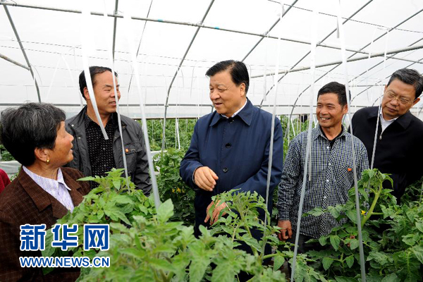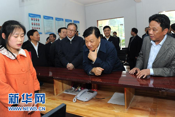 這是4月11日,劉云山在恩施六角亭街道辦事處頭道水村調研基層黨建。 新華社記者饒愛民攝