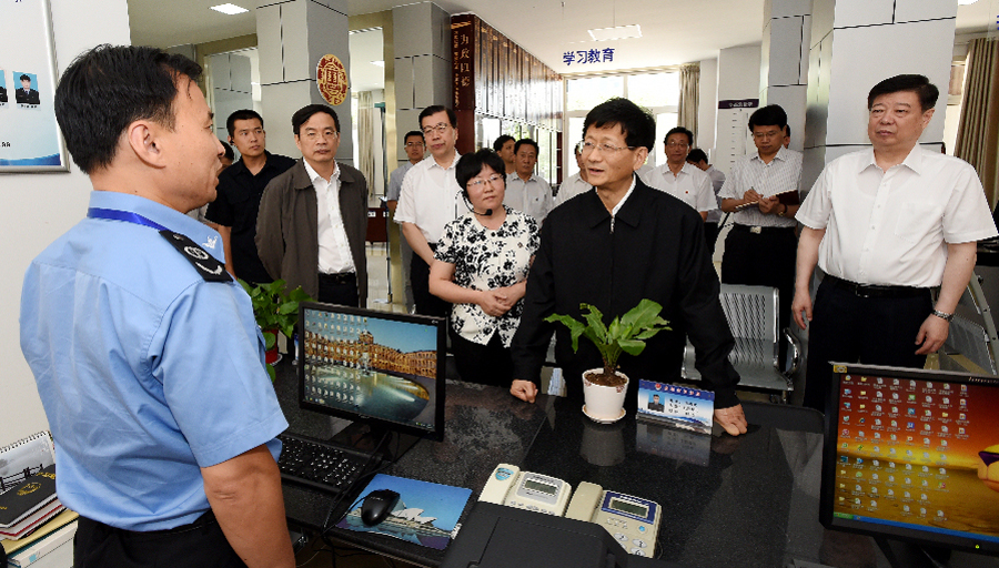 6月13日至17日,中共中央政治局委員、中央政法委書(shū)記孟建柱在山東調(diào)研。圖為6月13日,孟建柱來(lái)到曲阜市司法局社區(qū)矯正管理中心調(diào)研。