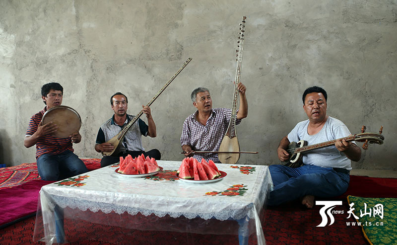 2013年以來,鄯善縣拿出資金,在全縣每個(gè)自然村建立農(nóng)民“文化大院”,給農(nóng)民提供文化娛樂的場所,十二木卡姆也自然成為大院里必備的節(jié)目,老藝人們忙碌了不少。最近正值齋月期間,村民間的文化活動照舊開展,蘇來曼 阿不都時(shí)常還要去周圍村里演出,最讓他高興的是,十二木卡姆這門古老的藝術(shù),在今天依舊被大家重視和喜愛,這一點(diǎn)對于他來說,比金錢更重要。“只要大家還喜歡十二木卡姆,在平日里能見到它,它的傳承和發(fā)展就有不竭動力。” 蘇來曼 阿不都說。