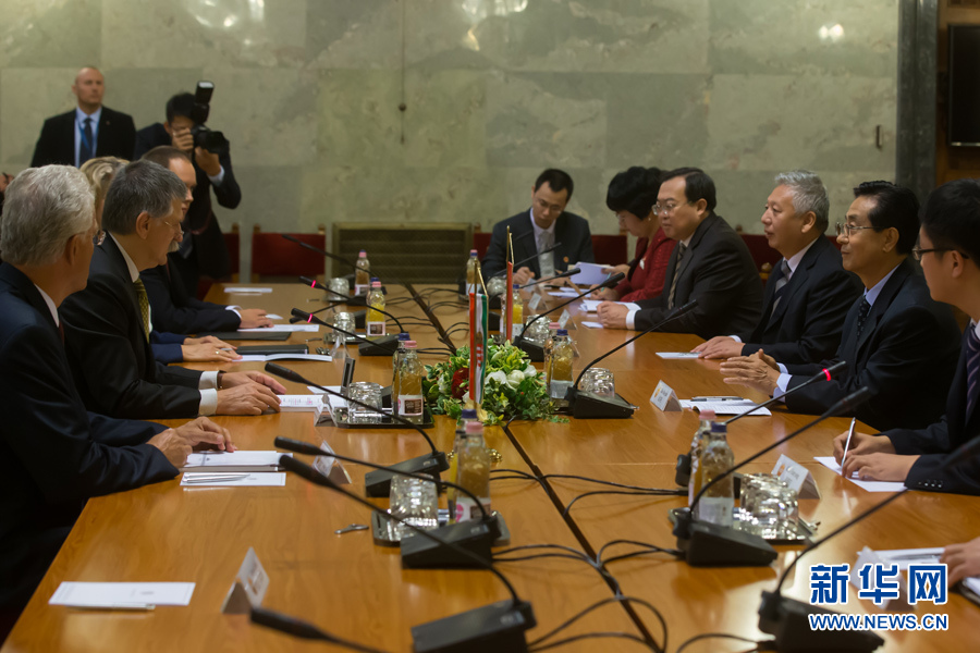 ??? 9月11日,中共中央書記處書記、中央紀(jì)委副書記趙洪祝(右二)在匈牙利首都布達(dá)佩斯會(huì)見匈牙利國(guó)會(huì)主席克韋爾(左二)。應(yīng)匈牙利執(zhí)政黨青民盟邀請(qǐng),中共中央書記處書記、中央紀(jì)委副書記趙洪祝率中共代表團(tuán)于9月10日至11日訪問匈牙利。新華社發(fā)(弗爾季·奧蒂洛攝)