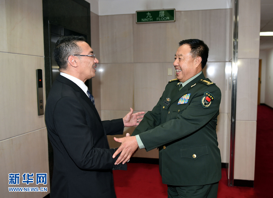 ??? 10月15日,中共中央軍委副主席范長龍?jiān)诒本┌艘淮髽菚妬砣A出席中國-東盟國防部長非正式會晤及香山論壇的馬來西亞國防部長希沙姆丁。新華社記者張領(lǐng)攝
