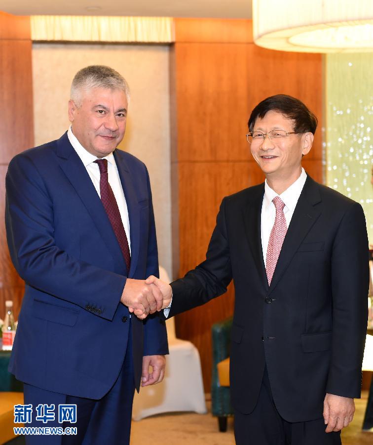 ??? 10月23日,中共中央政治局委員、中央政法委書(shū)記孟建柱在北京會(huì)見(jiàn)出席“安全促發(fā)展”中國(guó)東盟執(zhí)法安全合作部長(zhǎng)級(jí)會(huì)議的俄羅斯內(nèi)務(wù)部部長(zhǎng)科洛科利采夫。新華社記者張領(lǐng)攝