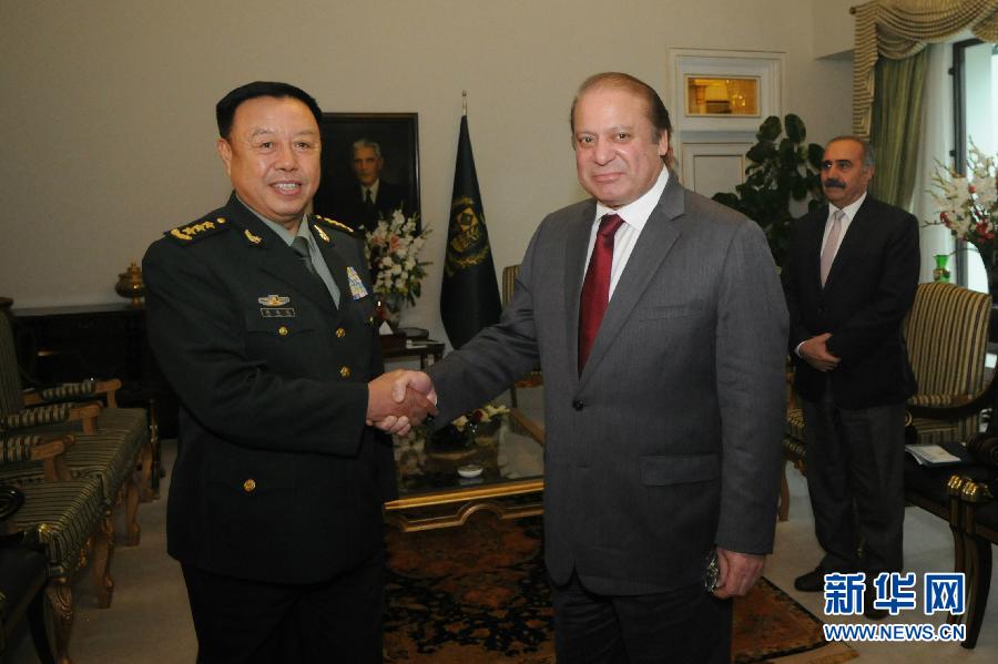 ???? 11月12日,在巴基斯坦首都伊斯蘭堡,中央軍委副主席范長龍(左)與巴基斯坦總理謝里夫握手。正在巴基斯坦訪問的中央軍委副主席范長龍12日會見了巴總理謝里夫。 新華社發(fā)(艾哈邁德·卡邁勒攝)