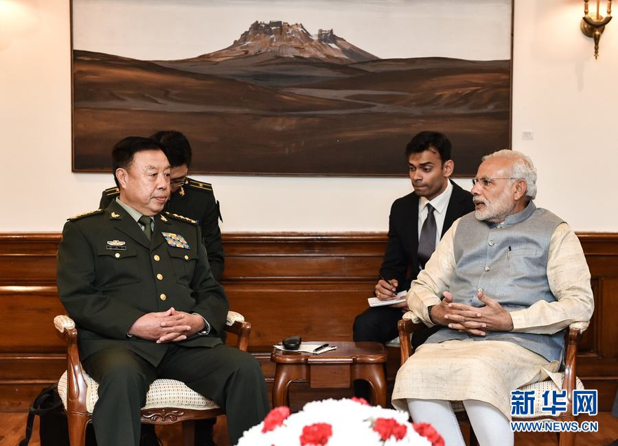 ??? 11月17日,正在印度訪問的中央軍委副主席范長龍(前左)在新德里會見印度總理莫迪(前右)。 新華社發(fā)