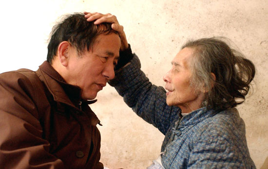雙目失明的孤寡老人撫摸著吳天祥的頭 資料圖