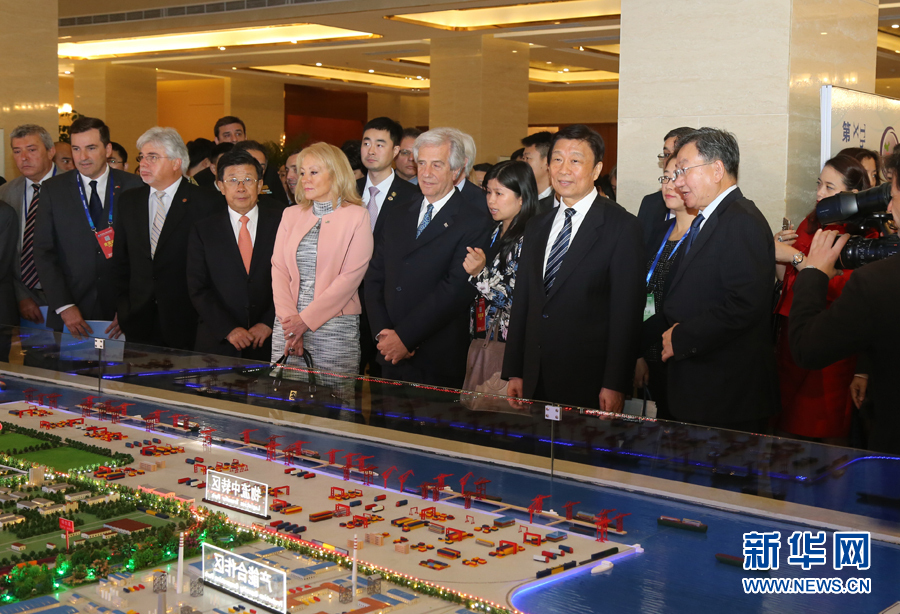 10月14日,中國(guó)國(guó)家副主席李源潮在河北唐山與參加第十屆中國(guó)-拉美企業(yè)家高峰會(huì)的烏拉圭總統(tǒng)塔瓦雷·巴斯克斯共同巡視中拉產(chǎn)能合作展覽會(huì)。這是李源潮與巴斯克斯參觀曹妃甸產(chǎn)業(yè)園沙盤(pán)。新華社記者楊世堯攝