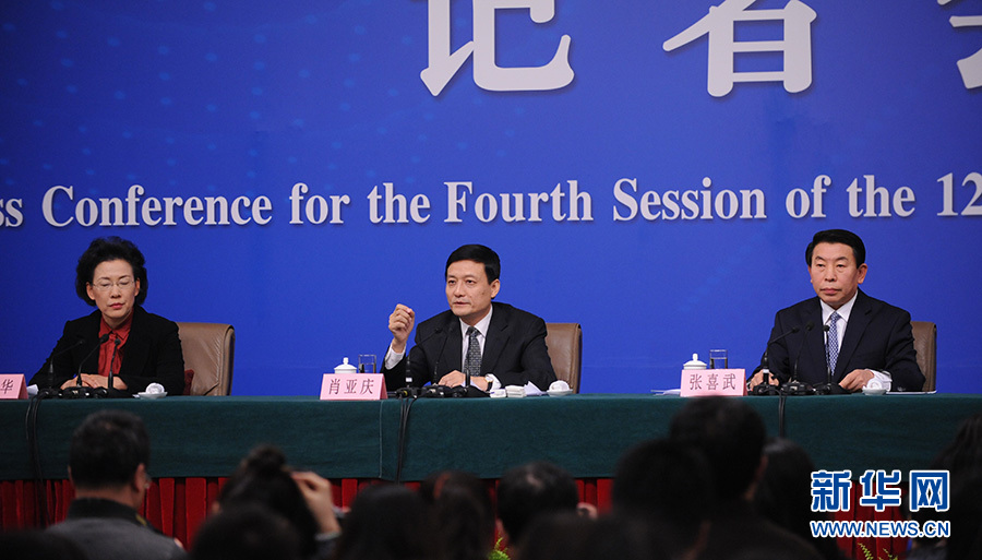 ?????十二屆全國人大四次會(huì)議新聞中心于3月12日(星期六)14時(shí)30分在梅地亞中心多功能廳舉行記者會(huì),邀請(qǐng)國務(wù)院國有資產(chǎn)監(jiān)督管理委員會(huì)主任肖亞慶、副主任張喜武、副主任黃丹華和副秘書長(zhǎng)、新聞發(fā)言人彭華崗就“國企改革”的相關(guān)問題回答中外記者的提問。圖為肖亞慶回答記者提問。新華網(wǎng)/中國政府網(wǎng) 陳杰 攝
