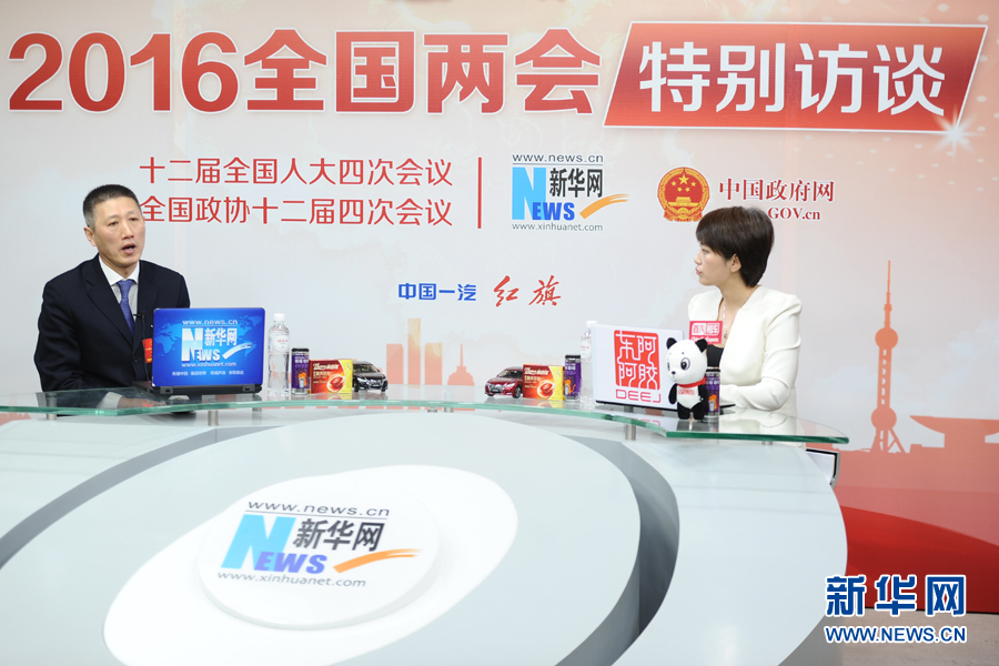 ??? 2016年3月13日,全國人大代表,煙臺張裕葡萄釀酒股份有限公司總經(jīng)理周洪江做客新華網(wǎng)兩會訪談。圖為周洪江在訪談現(xiàn)場。新華網(wǎng) 盧志佳 攝