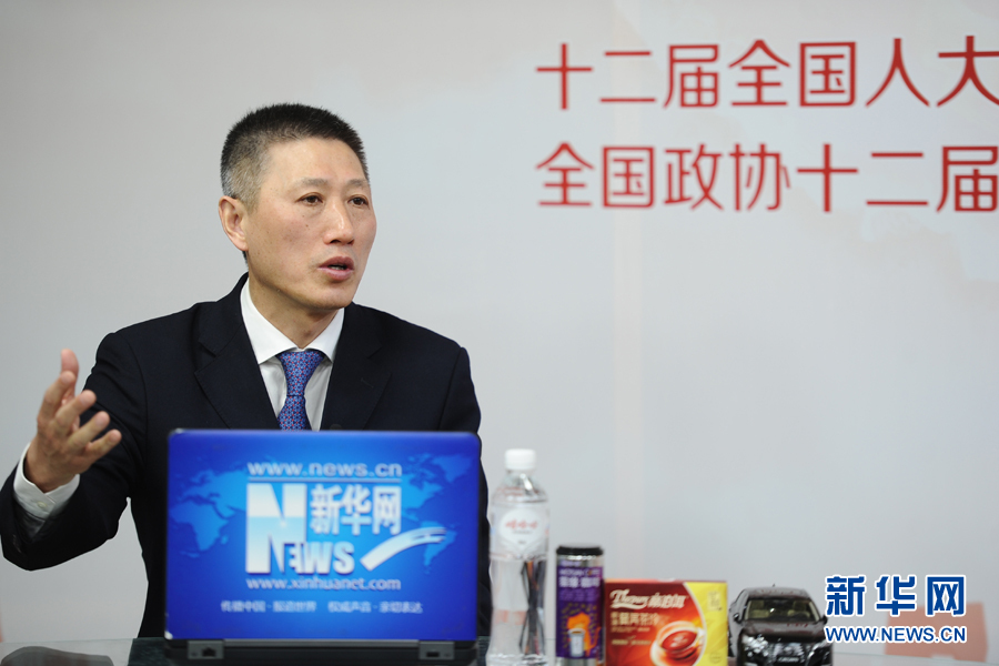 ??? 2016年3月13日,全國(guó)人大代表,煙臺(tái)張?jiān)F咸厌劸乒煞萦邢薰究偨?jīng)理周洪江做客新華網(wǎng)兩會(huì)訪談。圖為周洪江在訪談現(xiàn)場(chǎng)。新華網(wǎng) 盧志佳 攝
