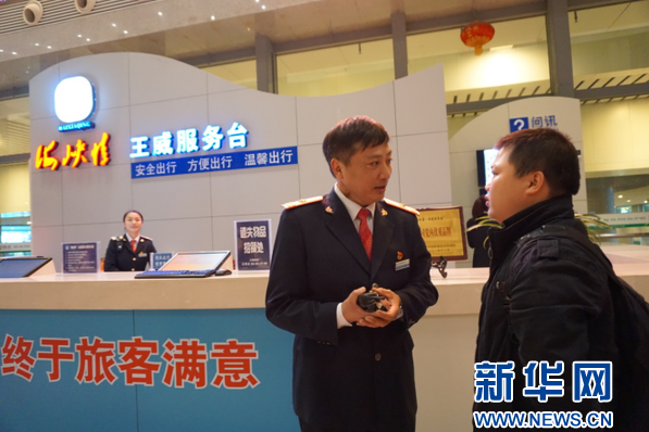 春運(yùn)期間,火車站客流量陡增,在擁擠的人潮中,藏藍(lán)色的身影會讓旅客的內(nèi)心平添一份安定?!澳?,請問有什么可以幫您”,“您這趟車快到檢票時間了,2號進(jìn)站口人稍微少一點”,“退票請帶身份證到5號窗口”。兩小時下來,這樣的話王威重復(fù)了成百上千次,手上水杯里的水卻幾乎未少。