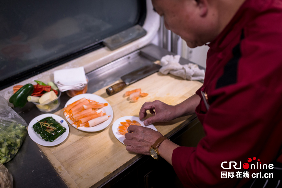 “有一名旅客,差不過每年春運都會坐這趟車從杭州出發(fā)前往海寧然后轉乘高鐵前往寧波,為的就是在我們車上吃一頓飯?!卑讕煾嫡f。圖為白師傅制作菜品。