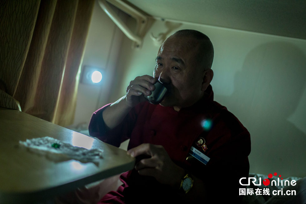 晚上11點(diǎn)多,大部分旅客已進(jìn)入夢鄉(xiāng),白振慶師傅終于可以回到休息室稍作調(diào)整,但只能小睡幾個(gè)小時(shí),凌晨4點(diǎn)白師傅還要起來為旅客準(zhǔn)備早飯。白師傅血壓偏高,每天晚上都要吃藥進(jìn)行控制。