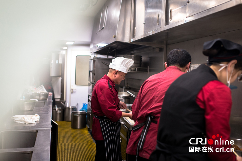 白振慶師傅說(shuō)餐車上的廚師必須要手腳麻利,旅客可以在餐廳里久等一些,但是在餐車吃飯的都是急茬兒的。白師傅1980年開始在餐車工作,今年是他的第37個(gè)春運(yùn),在這37個(gè)春運(yùn)中只有今年的除夕夜是在家過(guò)的。白師傅說(shuō)在家過(guò)年當(dāng)然高興,不過(guò)在車上和旅客一起過(guò)年,為旅客做一頓可口的年夜飯更是一種責(zé)任。