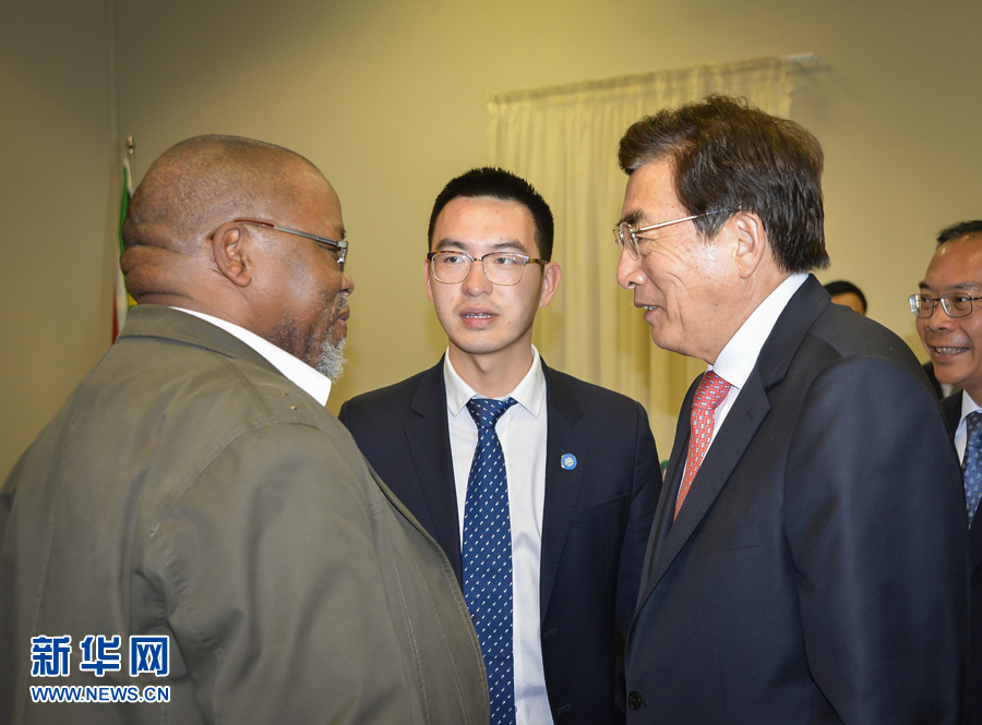 ??? 3月26日,中共中央政治局委員、北京市委書記郭金龍(前右)在南非約翰內(nèi)斯堡與執(zhí)政的南非非洲人國(guó)民大會(huì)總書記曼塔謝(前左)舉行工作會(huì)談。新華社記者趙熙攝